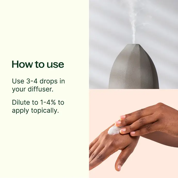 Aromatic: Diffuse using 3-4 drops per 100 mL of water or use in a personal inhaler.